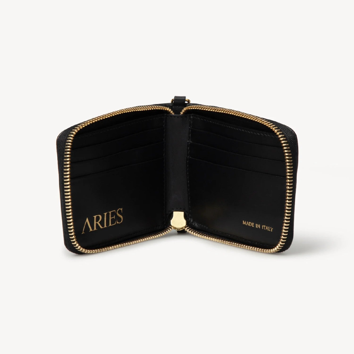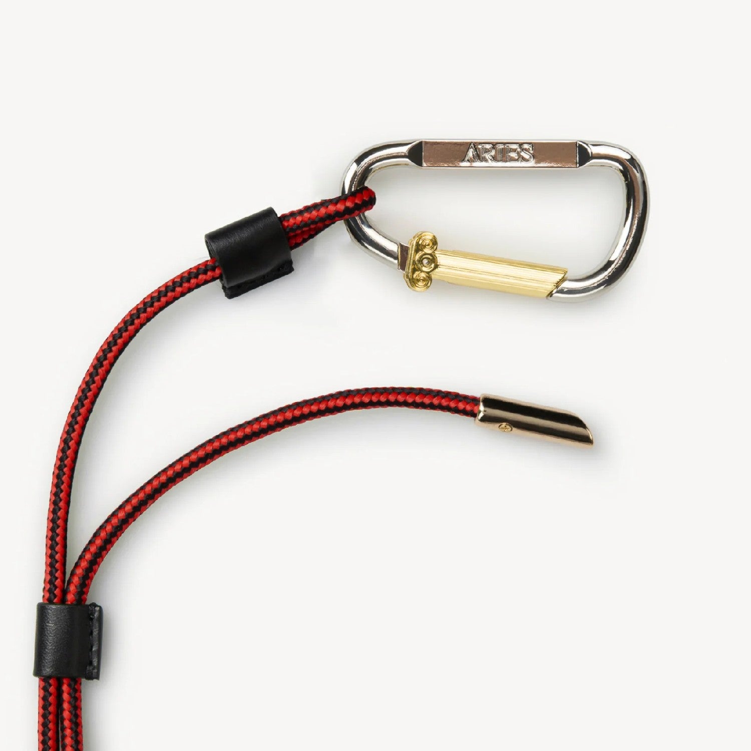 Leather wallet with metal temple plaque and rope to be used with Aries carabiner.