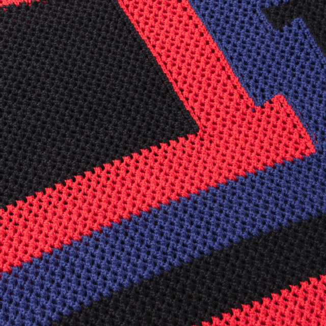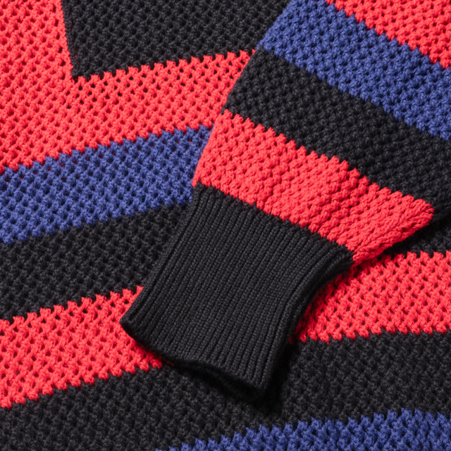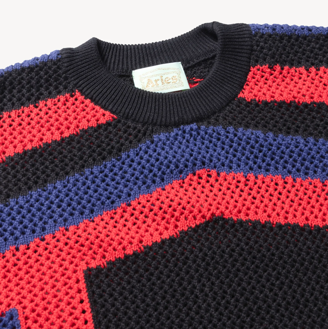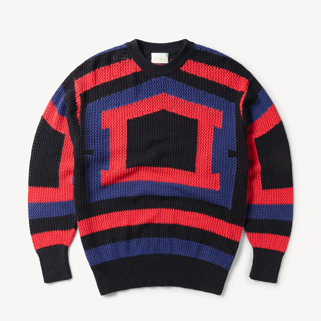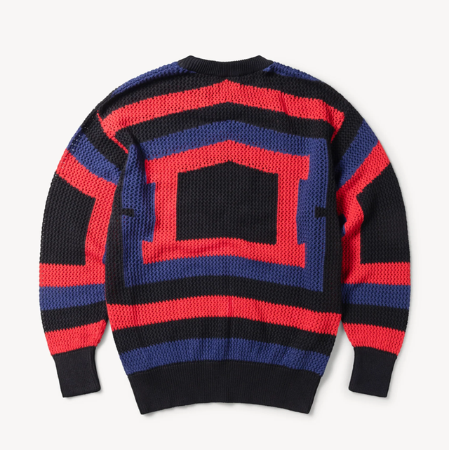 Unisex intarsia crochet pique crew neck jumper. With a temple motif on the front, back and sleeves. Made from 100% cotton organic yarn. Relaxed fit. Design will vary slightly between sizes due to knit technique.