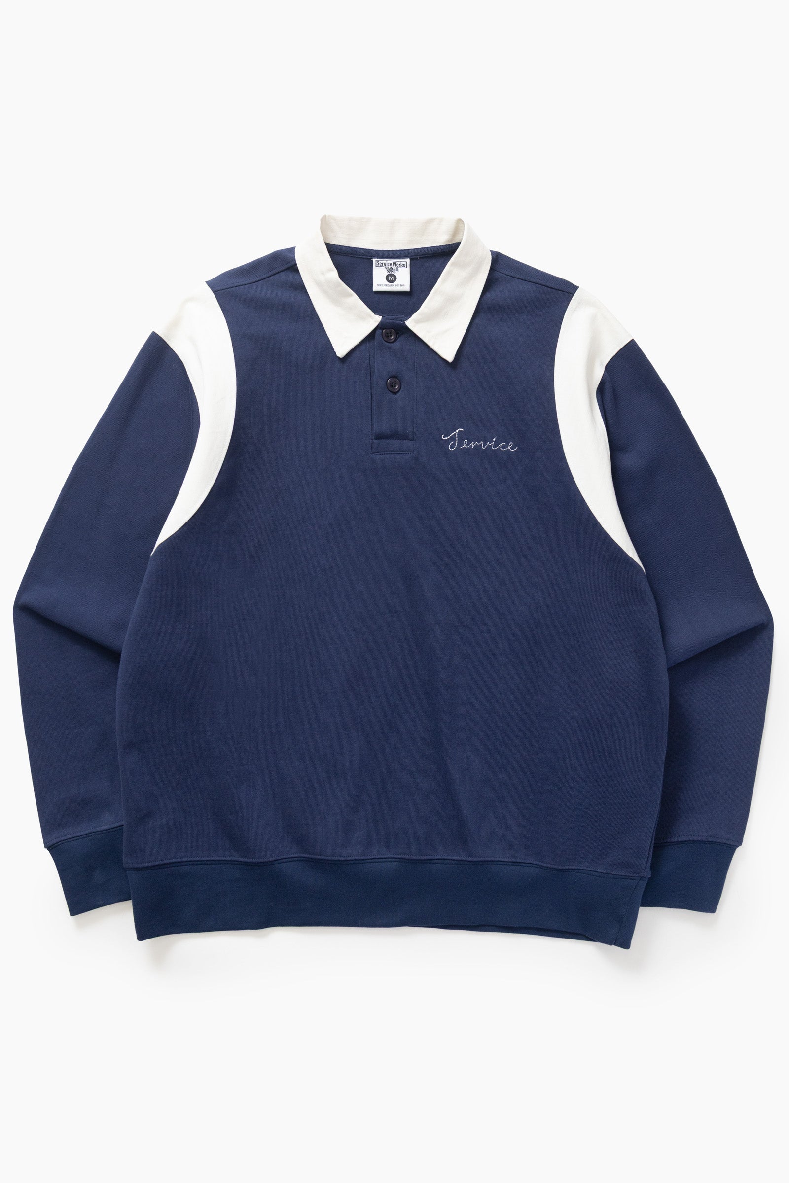 The Bistro Polo by Service Works, constructed with 425GSM GOTS Organic heavyweight cotton featuring herringbone shoulder and collar details, finished with elasticated cuffs and embroidered 'Service' detail.